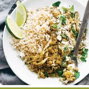 White rice and lentils with shredded chicken, fresh cilantro and quartered lime slices.